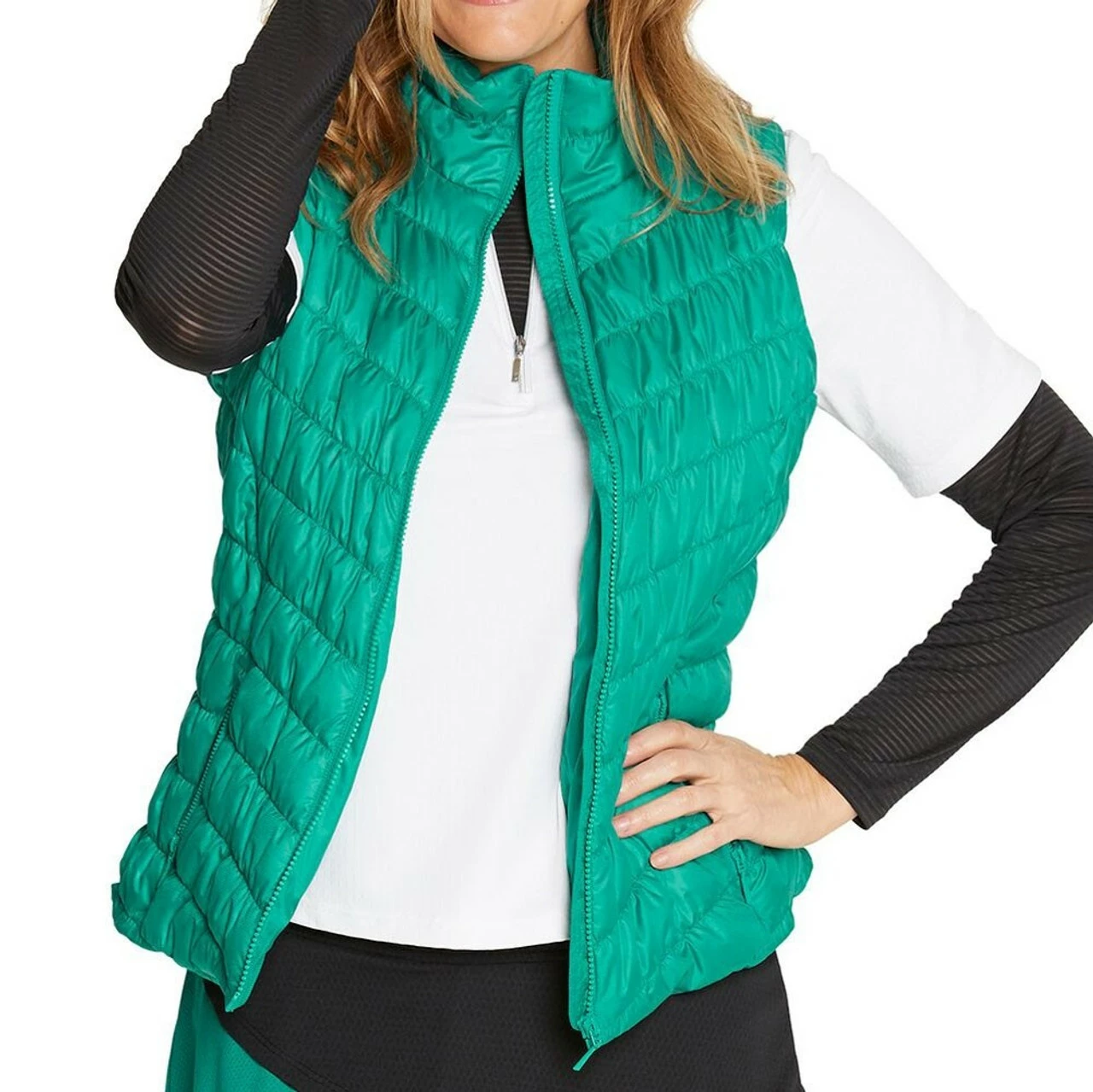 The timeless puffy vest has made it’s way to your golf wardrobe. The Venus Vest by GGBlue is a medium weight quilted vest that you can layer on cooler days, but won’t make you sweat thanks to the antimicrobial and moisture-wicking fabric. Two front pockets hold your tees, ball markers, or keep your hands warm, and the high collar is ultra chic.