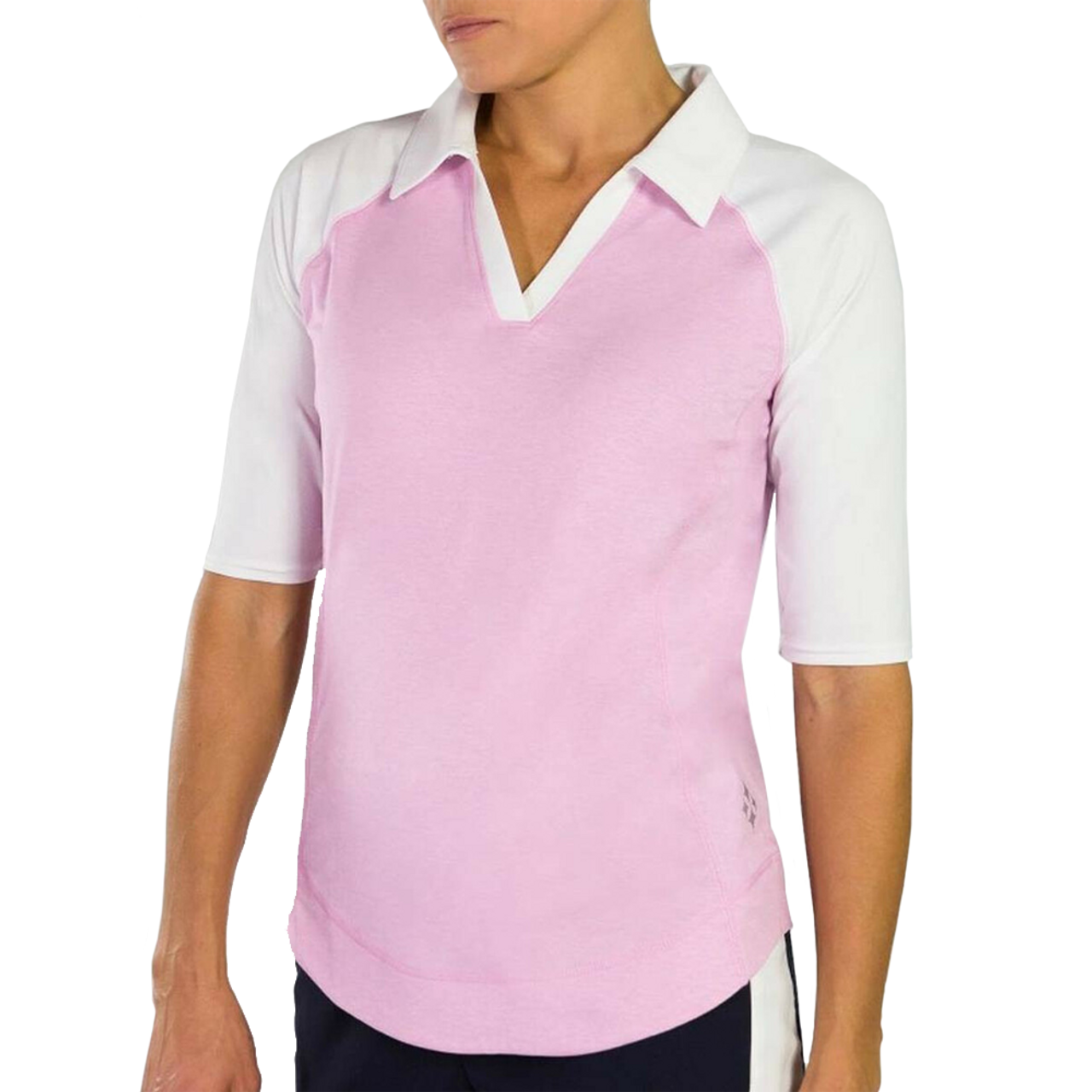 The JoFit 1/2 Sleeve Tech Polo is stitched with Melange Jersey fabric essentially to be flattering both on and off the course. This lightweight and comfortable polo features a feminine crossover v-neckline and a slimming seam down the front. Feel free to wear this style all day long. The very pretty bloom and white contrast provide added coverage.